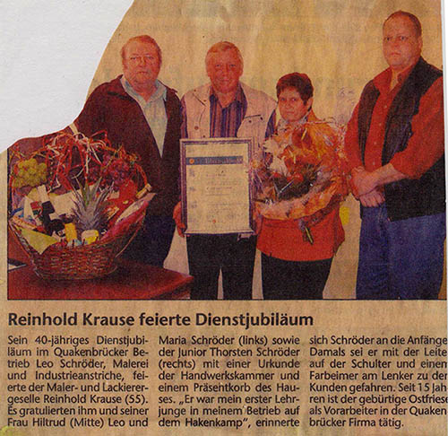 Die Geschichte der Firma Leo Schröder GmbH beginnt in den 1950er Jahren, als Hans Leo Schröder eine Lehre als Maler und Lackierer in Cloppenburg absolvierte. Dort arbeitete er bis er sich Anfang der 60er Jahre dazu entschließt die Meisterschule in Oldenburg zu besuchen, welche er mit dem Titel des Malermeisters abschließt. Im Anschluss, am 01.04.1963, machte er sich selbstständig und eröffnete sein Unternehmen in der Quakenbrücker Ligusterstraße.